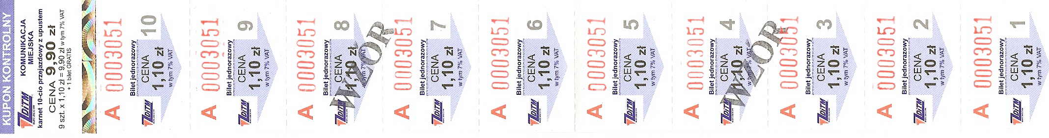 Są również w sprzedaży karnety 10-cio przejazdowe normalne i ulgowe w cenie: - 20 minutowe - 19,80 zł (N), 9,90 zł (U) oraz 60 minutowe 30,60 zł (N), 15,30 zł (U) na linie zwykłe tramwajowe i autobusowe z możliwością przesiadek,