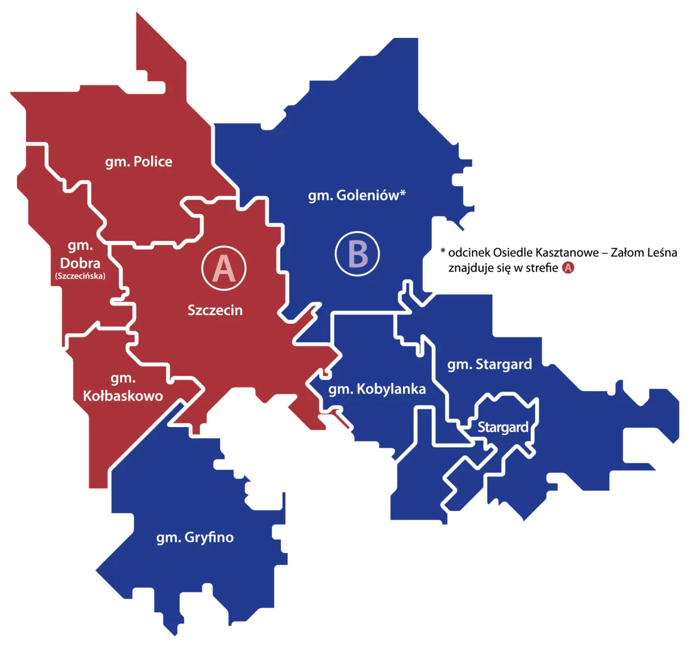 A - obszar Gminy Miasto Szczecin i Gminy Police oraz z komunikacji miejskiej w strefie A (tj. na obszarze Gminy Miasto Szczecin, Gminy Dobra, Gminy Kołbaskowo, Gminy Police oraz Gminy Goleniów na trasie Osiedle Kasztanowe - Załom Leśna