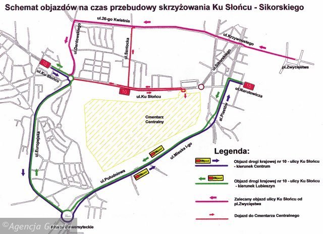 Jeszcze dwa, trzy tygodnie kierowcy będą korzystać z objazdów. Na razie jadącym do centrum na rondzie Gierosa radzimy więc skręcać w ul. Europejską, dalej przez rondo Uniwersyteckie, ul. Południową, Mieszka I, al. Piastów i ul. Narutowicza. Można z ronda Gierosa skręcić też w ul. Dworską, dalej Wierzbową. Jadącym od pl. Zwycięstwa do ul. Derdowskiego, polecamy ulicę Krzywoustego i 26 Kwietnia. Chcąc ominąć al. Bohaterów Warszawy i ul. Sikorskiego i dojechać do głównej bramy Cmentarza Centralnego z obu kierunków: radzimy jazdę ul. Ku Słońcu, Santocką, 26 Kwietnia, Krzywoustego i al. Piastów.
