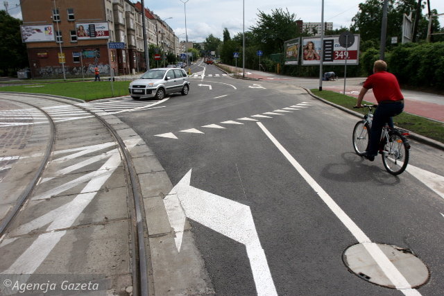 foto Cezary Aszkiełowicz/AG Strzałka na jezdni sugeruje jazdę pod prąd, ewentualnie... torami tramwajowymi