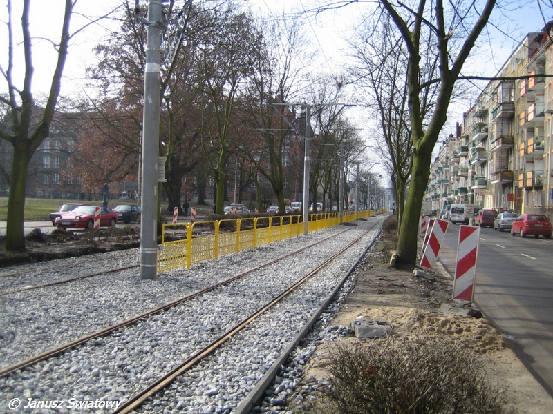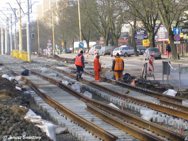 Ulica Sikorskiego i Ku Słońcu - stan zaawansowania prac. Zdjęcia z 13 lutego 2009 roku. Układane są tory na odcinku przy placu Kościuszki i zasypywane tłuczniem (przejście dla pieszych). W między czasie sprowadzono i wykorzystano podbijarkę do torów. Na odcinku od ulicy Tenisowej do bramy głównej Cmentarza zostały położone tory i zasypane tłuczniem. Również postawiono słupy trakcyjne.