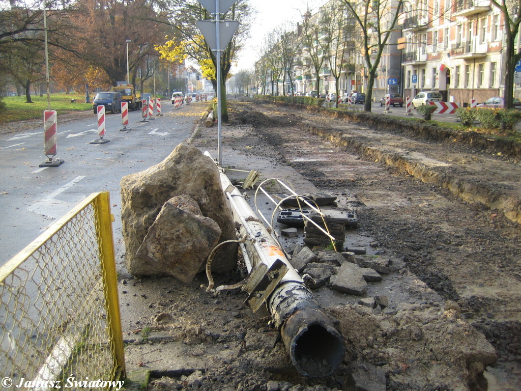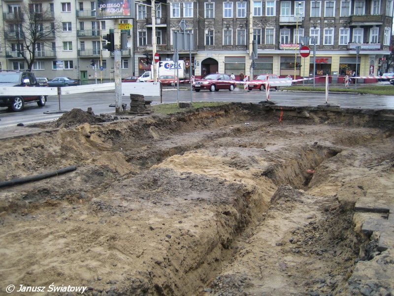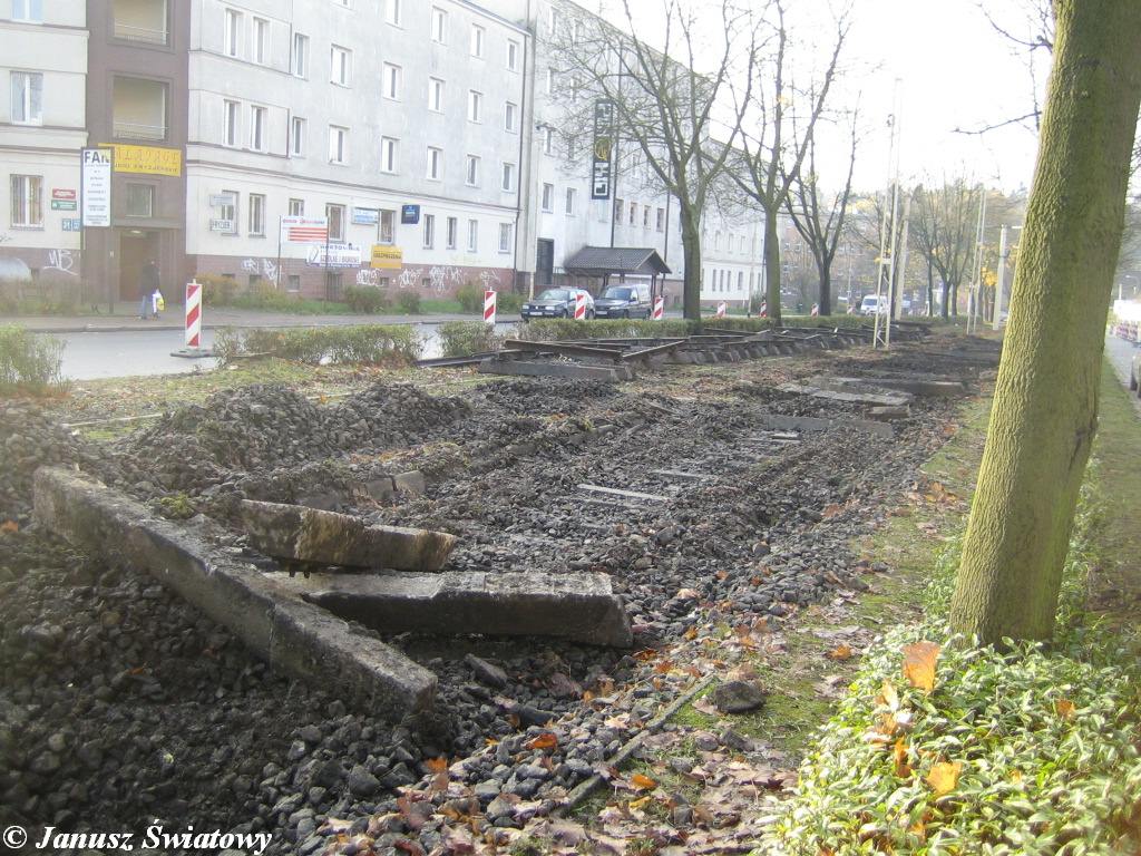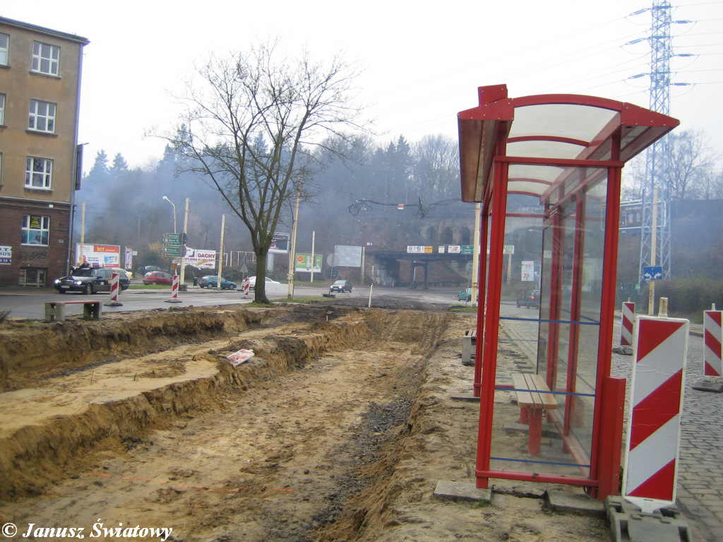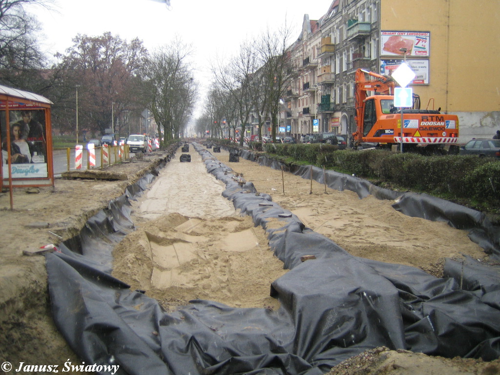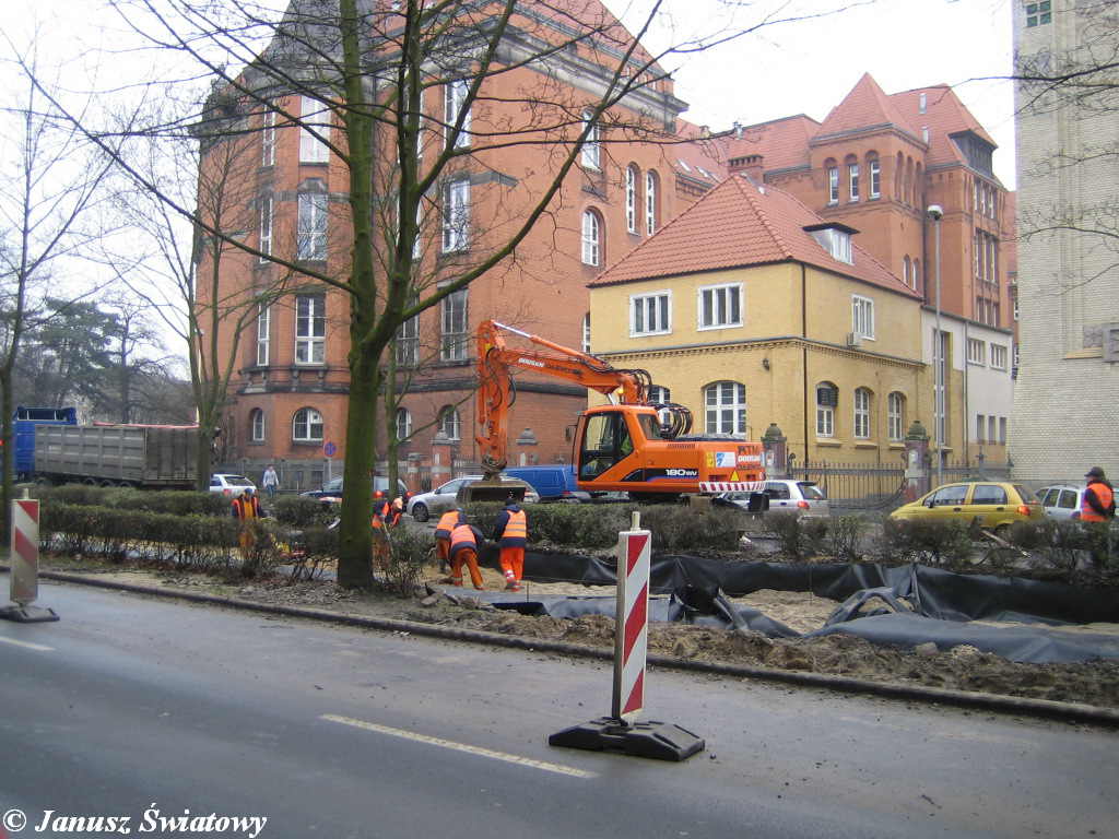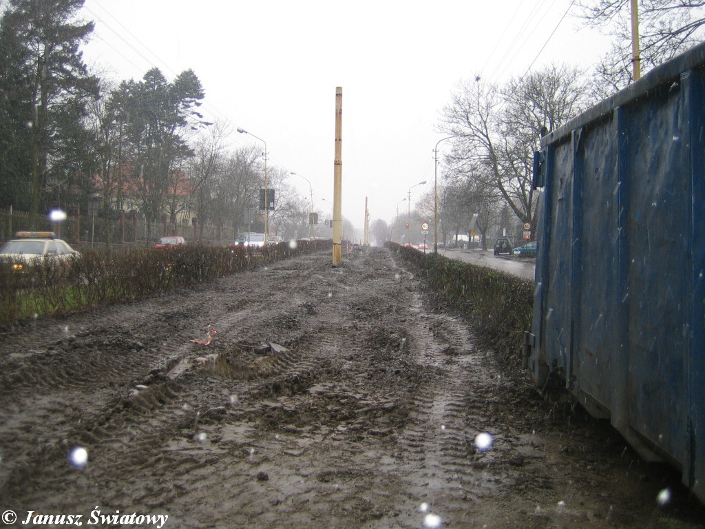 Ulica Sikorskiego - stan zaawansowania prac. Zdjęcia z 29 listopada 2008 roku. Usunięto stare torowisko tramwajowe, wykonuje się odwodnienie, kładzie się dreny i otulinę. Na odcinku od ulicy Tenisowej do bramy głównej Cmentarza wywieziono stare skorodowane torowisko. Przygotowuje się front robót.