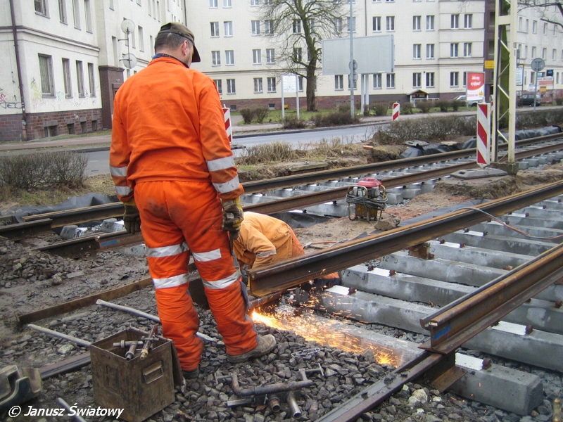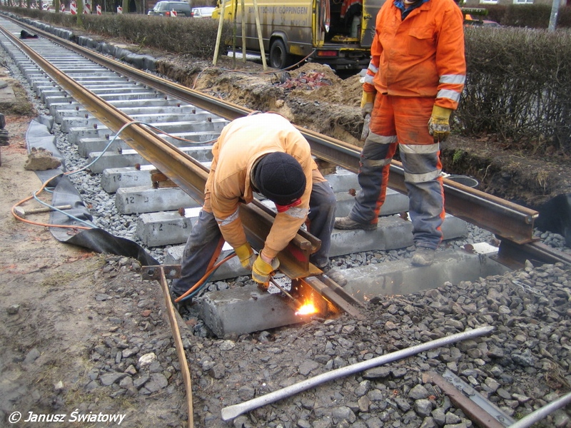 Ulica Sikorskiego i Ku Słońcu - stan zaawansowania prac. Zdjęcia z 24 stycznia 2009 roku. W dalszym ciągu trwają prace przy układaniu i kotwieniu torów do podkładów. Podwykonawcy z Wrocławia zatrudnieni przez MPK Łódź szlifują i spawają tory.